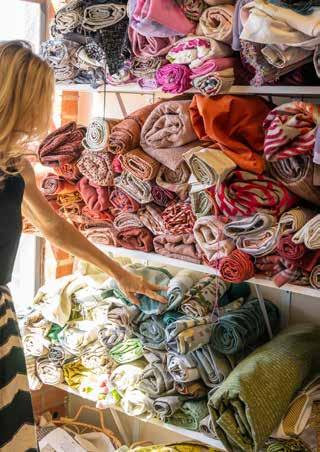 A: I was throwing away tiles in a dumpster at the Denver Design District. Instead of the usual loud CLANK sound, I heard a soft thud. I looked inside and found two trash bags filled with stunning textile scraps––one had a tag that read “$600/yard.” Some were little pieces just a few inches big, others were yards long, and I decided to try making some one-ofa-kind pillows and people loved them––so I decided to make it a business.