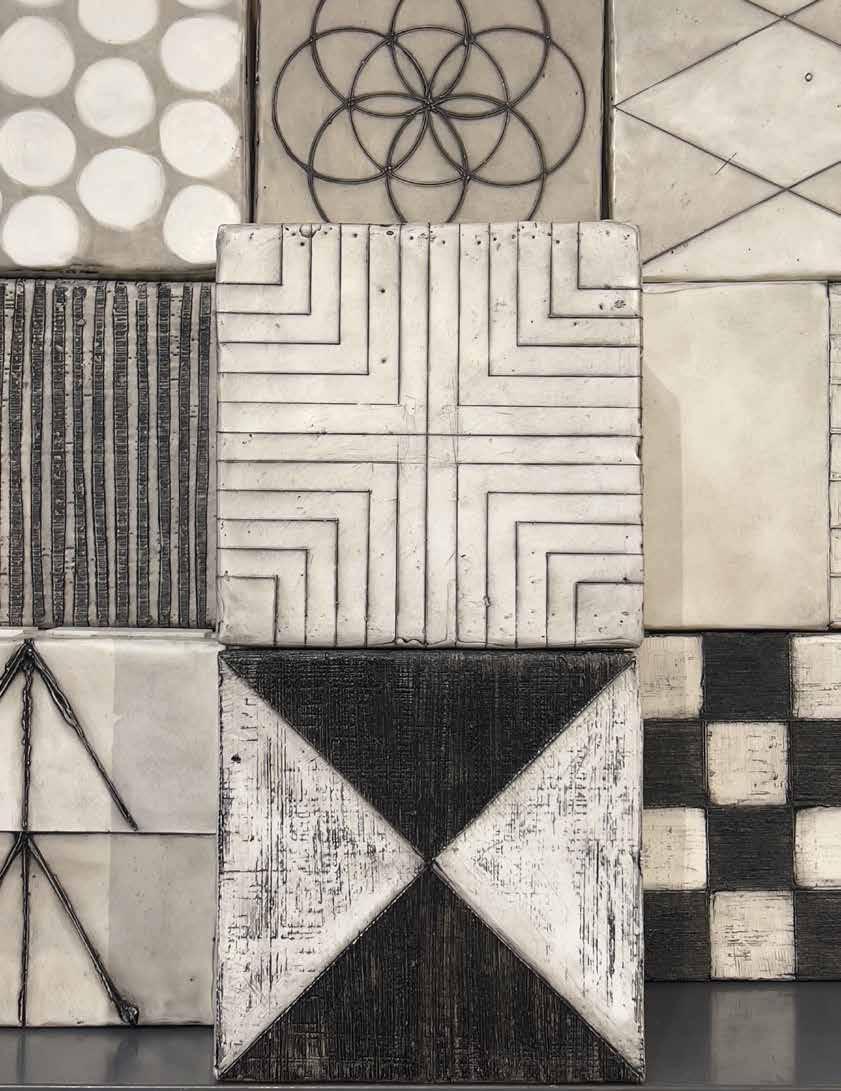 palette, her technique emphasizes the architectural and organic nature of the beeswax by intentionally featuring cracks, chips and scratches on the surface of the paintings.