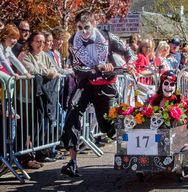 Haven’t been? Picture this: Dozens of hand-built “coffins” on wheels manned by costumed, five-person teams – “Emma” in the coffin and four “mourners” push ing the rigs 195 yards down the street to the finish.