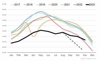 • This year (the black line) is truly unique. The steep drop off in new listings that usually occurs this time of year hasn’t happened. If 2023 followed the norm, the line representing this year would look more like the dotted black line. Instead, what’s happening is the number of new listings is stabilizing. And, there are even more new listings coming to the market this year compared to the same time last year.