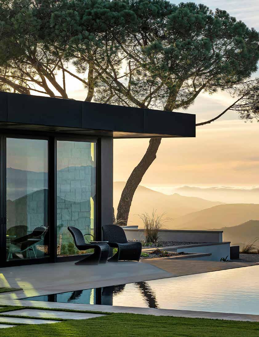 Built on a premiere ocean view lot, The Quincy graces one of ten 20-plus acre parcels in the 250acre gated White Stallion community that was originally purchased by Sylvester Stallone. Designed for entertaining and family living, the 300-foot-long home has a motorized door that closes off your living space for enhanced privacy. The home includes the latest in automated features that can all be controlled by an app. Built in the style of midcentury modern Eichler Homes that Nick’s grandfather specialized in designing, The Quincy features indoor rock touches, indoor/outdoor living spaces and floor to ceiling glass windows.