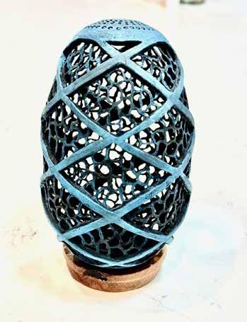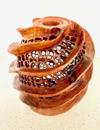 While Joel has experimented with many kinds of projects ranging from bowls and candy dishes to salt cellars and ring holders, his most exotic pieces are his unique honeycomb-textured decor pieces. These intricate and stunning pieces are made with the lathe to get their general shape, cut into separate pieces that are hollowed and thinned out, glued back together and pierced with a highspeed drill to create the honeycomb pattern.