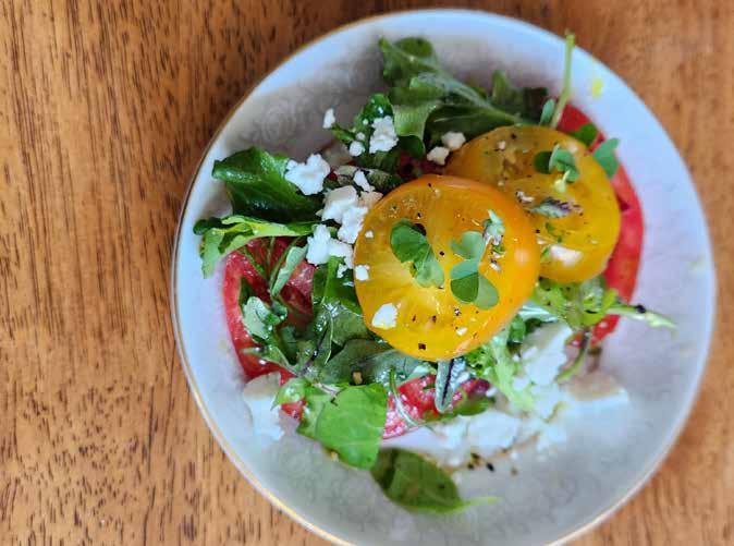 1. Plate the red tomato slices at the base of the salad (2 per person) 2. Season with a sprinkle of salt & pepper 3. In a medium bowl, whisk oil, lemon juice, honey, a pinch of salt & pepper. Add spring greens & feta, toss to coat 4. Pile on top of red tomato. Top the greens with the yellow tomato, sprinkle with salt & pepper and a few green onions