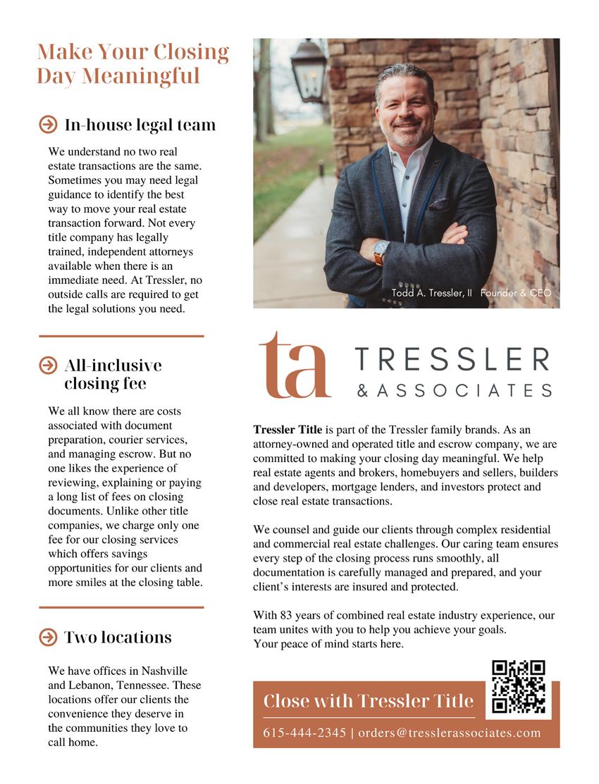 Purchasing a home or business property can be an overwhelming experience. When Todd Tressler II founded Tressler & Associates/Tressler Title, he recalls intentionally establishing an overall process to title and escrow management that enables services to be straightforward, thorough and simplified. Unlike deeds, titles represent the legal right to own and sell a property. Here, he shares important notations for Music City City Lifestyle readers.