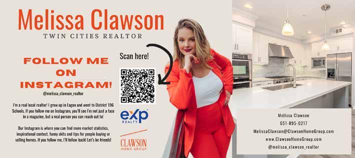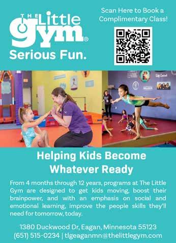 ACCESS TO CONVENIENT AND AFFORDABLE CHIROPRACTIC CARE JUST GOT EASIER L e a r n M o r e a t C h i r o W a y . c o m / E a g a n B r y c e H i l l , D C | O w n e r & C h i r o p r a c t o r | 1 0 1 2 D i f f l e y R d , S t e 6 0 0 C h i r o W a y o f E a g a n , N o w O p e n ! 651-348-7361 HOME OF THE DRAM EVERY WEDNESDAY IS WHISKEY DAY www.eaganarms.com more information VIKINGS PARKWAY NOW OPEN 20 MINUTE SESSIONS. LIFE CHANGING RESULTS. ONE-ON-ONE TRAINING LOW IMPACT INCREASE STRENGTH AND ENDURANCE ENHANCE MUSCLE DEFINITION REDUCE FAT AND CELLULITE IMPROVE HEALTH AND WELL BEING REDUCE LOWER BACK PAIN CORRECT POSTURE 20 MIN = HOURS IN THE GYM BOOK YOUR FREE DEMO 855 VIKINGS PARKWAY EAGAN, MN 55121 PHONE: 612 235 6788 EMAIL: VIKINGSPARKWAY@BODY20 COM 39 JUNE 2024 | CITYLIFESTYLE.COM/EAGAN