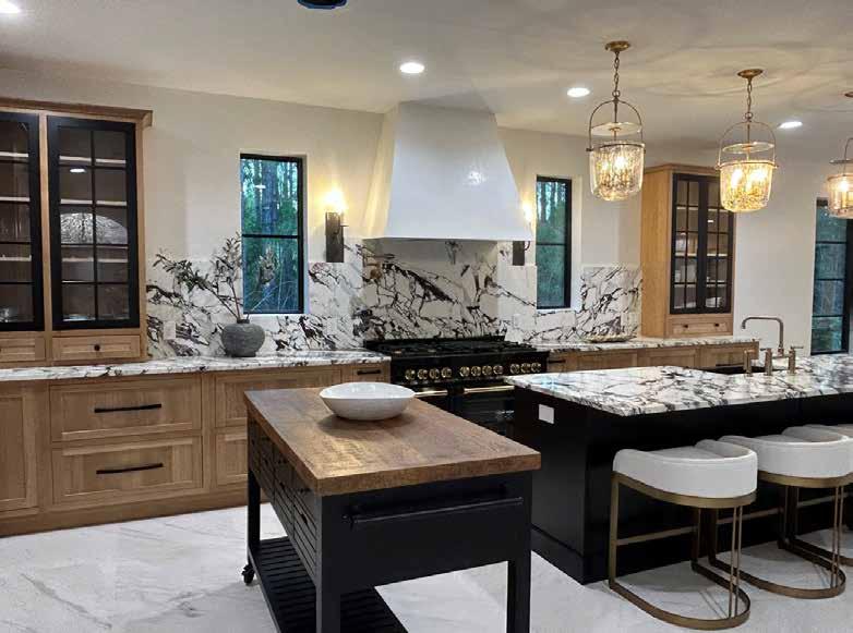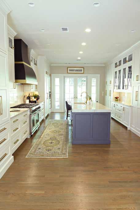 as fitted cabinets, exquisite quartzite, high-end appliances, and upscale hardware to create a simple, yet luxurious feeling. Clients like gold and black tones for hardware and light fixtures, with the most popular cabinet colors being light or warm neutrals and blues and greens, which are still trending.”