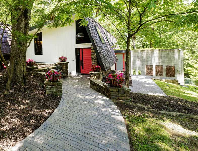 While the house’s history attracted the Zweigs to purchase their new home, its mid-century modern layout and design is what sold them to close the deal. Among the house’s design features are vaulted ceilings lined with wooden beams, tall windows that overlook Mt. Sequoyah’s greenery and wildlife, and two stone fireplaces with a dual-floor shared chimney in the middle of the home. The house also features two additions from nationally-renowned and Fayetteville-based architect Marlon Blackwell: a fully-equipped home gym crowned with a living roof (completed through Arkansas-based Ozark Green Roofs) and a fourcar garage furnished with a Tesla car charger and glass roof panels, according to Zweig.