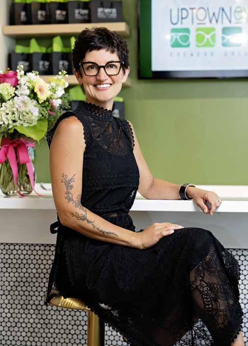 running wishlist of brands they’re excited to bring in, adding new lines slowly and thoughtfully. Clients can even customize their frames, creating one-of-a-kind pieces that are truly wearable art. But what’s perhaps most unique is the way this care for detail also shapes their team culture. Uptown Eyes hires based on heart and chemistry—believing skills can be taught, but character can’t. They meet regularly in what they call “Polish” sessions, dedicated time to reflect on the customer experience and fine-tune every detail. Whether it’s refining how eyewear is presented or making a small but meaningful change to improve the flow of a visit, the focus is always on making clients feel heard, comfortable, and appreciated. Their brand-new location, thoughtfully designed to support their growing clientele, is just the latest chapter in the Uptown Eyes story. The space offers more square footage, easier parking, and a more expansive layout, allowing guests to browse frames with ease and comfort. It also includes a dedicated dry eye treatment suite, something the team is especially excited about. This addition enables deeper diagnostic testing and more specialized care in a welcoming, spa-like environment. But even with the expansion, nothing about Uptown Eyes feels impersonal. The values that defined the practice from the beginning—kindness, integrity, and experience—continue to guide every decision. Their connection to Fayetteville’s creative spirit remains strong, too. The team has a tradition of highlighting local artists, most recently through two striking murals: an interior piece by Joelle Storet Holt and a vibrant exterior mural by Jeremy Navarrette ( Brickandcanvasart.com). “We love being a part of