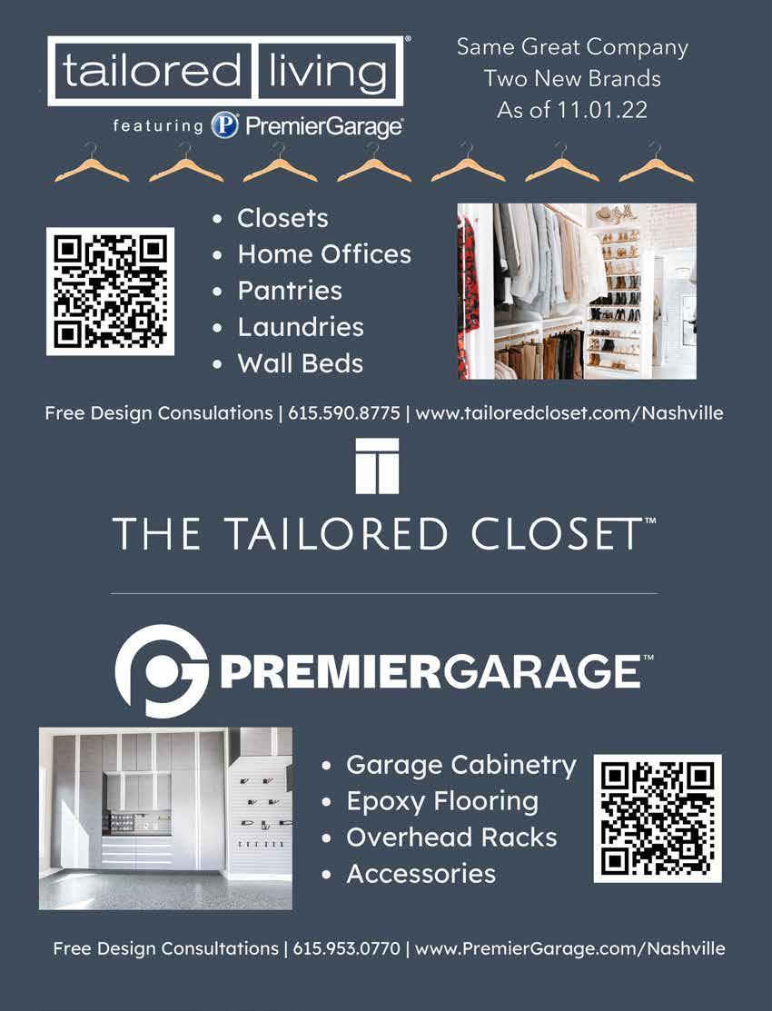 The Tailored Closet of Nashville & PremierGarage of Nashville are both owned by Mindy and Tim Bledsoe, longtime Nashville area residents. In 2017, the Bledsoe’s decided to open Tailored Living featuring PremierGarage to help make their homes a more enjoyable place through customized organization solutions. In 2021, the Bledsoe’s were recognized as Home Franchise Concepts, Franchise of the Year, acknowledging their growth and service.
