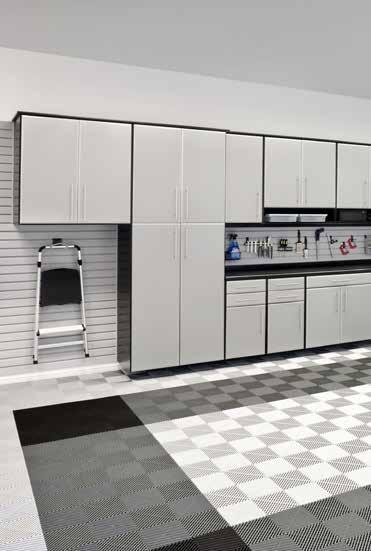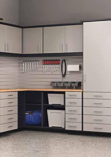 factory in Franklin, we manufacture our own cab inetry, including tall floor units, work benches, upper storage bins and rolling cabinets. By build ing our own cabinets, we can ensure that they are perfect dimensions for each garage.”