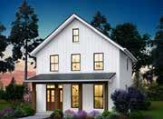 This home’s exterior channels a modern farmhouse feel with vertical board and batten siding and a standing seam metal roof. The color palette is bold and unified—dark bronze walls, roof, and window trim create a sleek, dramatic look. Warmth and character come from the wood accents featured on the porch columns and beams, offering a striking contrast to the darker elements and enhancing the home’s curb appeal.