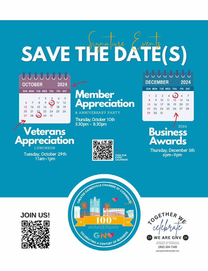 As a member of the Greater Gainesville Chamber, you will be among a group of more than 1,300 companies that enjoy enhanced opportunities for visibility, education, networking and credibility. Join us for the 100 Members in 100 Days Challenge! Call the Chamber at (352) 334-7100 and let the amazing staff know you want to join today!