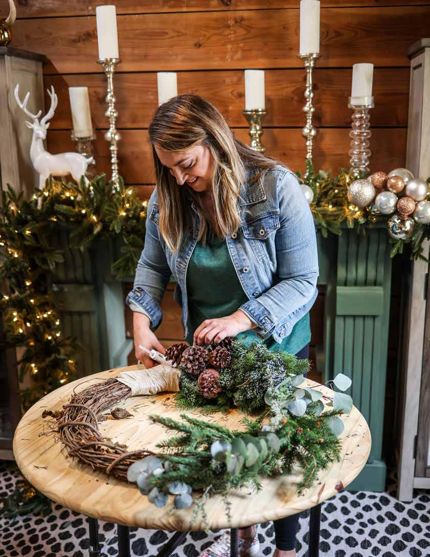 Continue adding fresh green clusters going down your wreath and slightly alternating the angle the greens are pointing. Finish your final cluster and give yourself 3-4” of additional wire to twist close at the back of the wreath to finish and secure.
