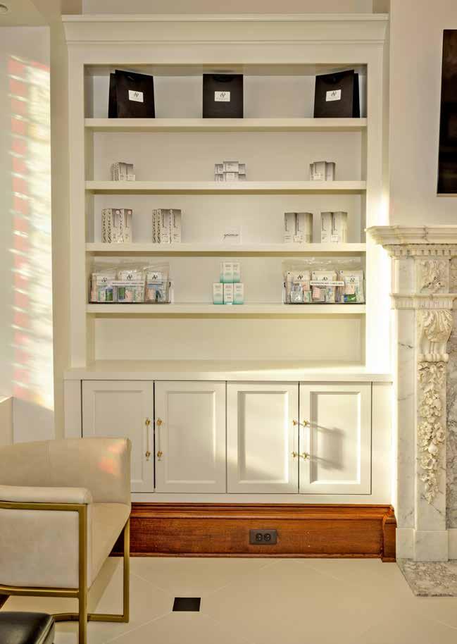 Even the building she chose for her practice is filled with unique characteristics. “There’s a ton of history, and as soon as you walk into the lobby, there’s a wow factor! We put in this cool black-and-white flooring and really modernized it, but it’s still very historic and true to Grosse Pointe. It has this gorgeous hand-carved English oak paneling from the grand foyer of the former Stone Hurst Estate.” (Built in 1914 for Joseph Schlotman