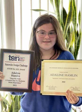 “Last year, one of our HIHO students, Adaline Hamlin, par ticipated in a program to develop a solution to help people in our community,” says Jennifer. “She designed and developed a special lunch tray to keep food from sliding off. After building a prototype, Adaline worked with our school 3D print club to manufacture the finished tray. Subsequently, she was recog nized by the Tennessee STEM and Innovation Network for her innovative project.”