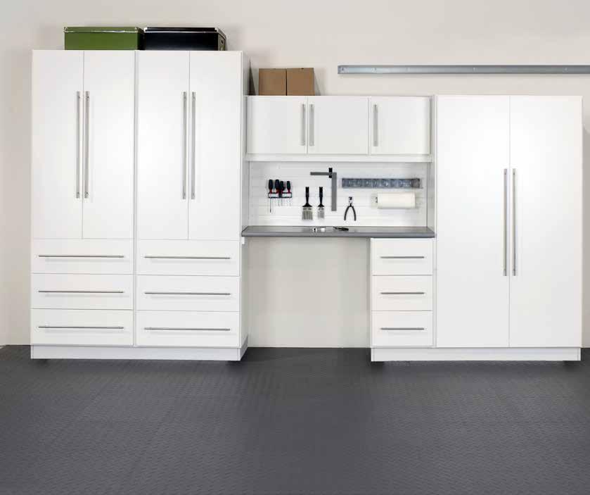 “Most redesign projects begin with the instal lation of custom cabinets,” says Sandra. “In our factory in Franklin, we manufacture our own cab inetry, including tall floor units, work benches, upper storage bins and rolling cabinets. By build ing our own cabinets, we can ensure that they are perfect dimensions for each garage.”