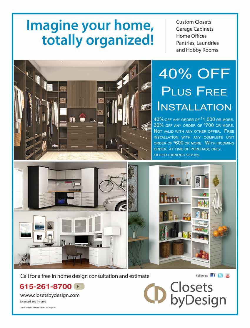 “Although the trend is a relatively recent phe nomenon for many homeowners, we have actually been doing garage remodeling projects since 2000,” says Sandra Sokol, owner of Closets by Design of Nashville, Middle Tennessee’s leader in optimized storage solutions. “We did over 100 turnkey garage projects during 2021, and we will more than double that number this year.”