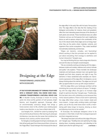 footpath and front door, property and right of way…The elements in these residential-scale examples are macrocosmic expressions of the edge effect. As designers, we are always thinking about the interface. The edges are rich and offer up opportunities to come up with unique solutions.” With the edge effect, your landscape architect will be mimicking the curves and contours of nature. “In design-