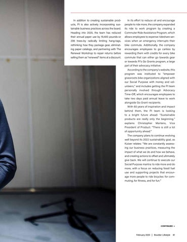 commute that can either go towards gear or towards PI’s Go Grants program, a large part of their advocacy initiative. According to the company's website, this program was instituted to “empower grassroots bike organizations aligned with our Social Purpose with money and volunteers,” and includes getting the PI team personally involved through Advocacy Time-Off, which encourages employees to take two days paid annual leave to work alongside Go Grant recipients. With 60 years of inspiration and impact behind them, the PI team is looking to a bright future ahead: “Sustainable products are really only the beginning,” explains
