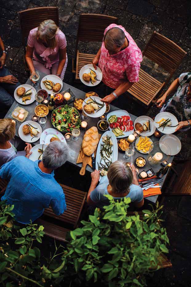 • Draw inspiration from the season’s colors and temperatures. For Spring and Summer, think flowers, fresh herbs and linens. For Fall, think flannel blankets, wooden tables, fire pits, open grills, string lights and candles to create a really cool environment you haven’t been able to do all summer.” For Winter, head indoors to create a cozy environment for guests to connect.