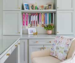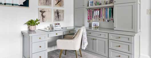 of hard-earned gymnastics medals by framing them in the functional cabinets. She added a glass topper to the desk to allow free-flow crafting.