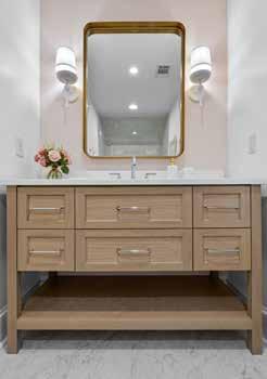 They picked a vinyl wallpaper so the steam won’t distort the dyes or soften the color. Polished nickel hardware provides a shine and the lamp-shaded sconces on each side of the framed mirror are sophisticated but restrained.