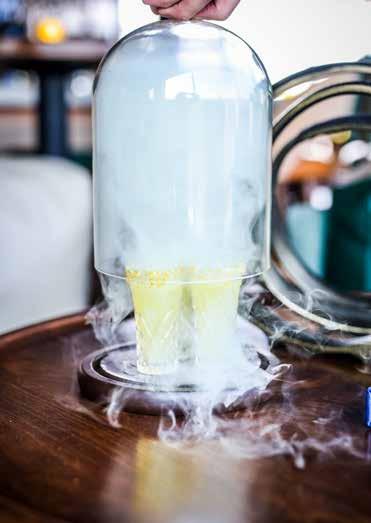 Fun and show-stopping craft cocktails include 12 specialty drinks ranging from bright and fruity to bold and spiritous, includ ing the Parisian Breeze, Elderflower Paloma, the Gatsby, or the must-try Smoked Old Fashioned that includes a dramatic unveil ing of mesquite smoke at your table. Batch shareables are served in oversized cut-glass decanters with spigots and include spiced sangria, Party Potion or the Ma’homes, a bourbon/champagne showtime libation with pomegranate and fresh lemon.