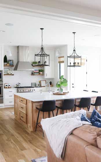 “I wanted to create a timeless design aesthetic that I would still like in 10 years, and a large open floor plan with a warm and cozy feel,” she says. “Although the house is new, I tied in as much ‘old’ as possible, with wood beams, mantles, countertops, shelv ing and backsplashes throughout the home harvested from torn down barns in the area. You can see divots and holes from the imperfections, and I love it!”