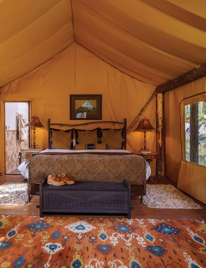 Luxury Homes are categorized into preference-based properties that boast the thrill of wilderness living. For larger families and multigenerational groups, consider the Wilderness Estates. At 3,250-squarefeet, these estates sleep up to eight guests and feature three large suites with private baths. The Big Timber Homes are available in one-to-three bedroom options and come ornamented with fire places and private decks. The Meadow Homes are 1,100-square-foot single-story homes that sleep up to four guests, situated amid a pastoral and treed setting. For an extra nod of perfection, choose one of the luxury homes that comes equipped with a private tent—ideal for anyone traveling with children (or adults who beckon back their childhood!).