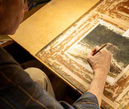 details of an image, a photographic memory, was beginning to develop in him and would serve him well in the future. His time outside inspired Thomas naturally to get out his own paper and paints where his dad began to show him how to shape a tree trunk, how to express bark texture, and over time how to paint a sky suggesting the feeling of clouds using color.
