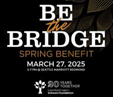 Join Lake Washington Schools Foundation on Thursday, March 27, from 5:00 PM to 7:00 PM at the Seattle Marriott Redmond for a milestone Be the Bridge spring benefit commemorating twenty years of making a difference. Connect with local leaders, volunteers, and other changemakers who’ve helped transform education over two decades. Let's honor what we’ve built together—and get inspired for what’s next! Details and registration at lwsf.org/bethebridge.