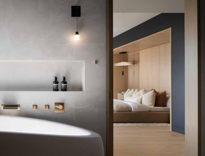 The primary suite is a serene retreat, where sweeping water views and layered textures create a sense of quiet luxury, flowing seamlessly into the spa-like bathroom beyond.