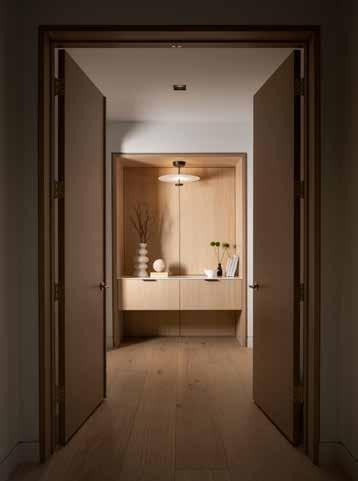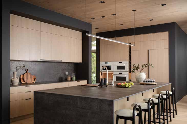 The kitchen, with its warm wood Henrybuilt cabinetry and sculpted stone island accented in sleek black, is equally striking — a space where meticulous craftsmanship meets effortless functionality, creating a natural gathering place for family and friends.