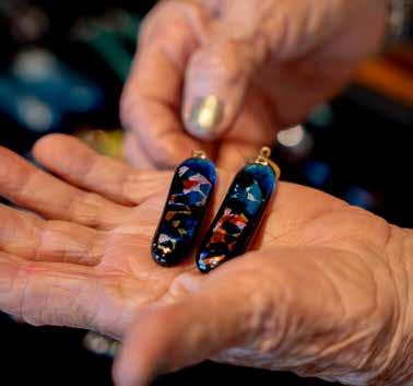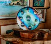 “I can’t just go make them, though. I have to be inspired. Some days, I wake up and can’t wait to break glass!” Rosemary exclaims, referring to her Fused Glass collection, which requires an exacting method that produces a poetic result. On other days, she is inspired to focus on her Green Designs, crafted of natural fibers and materials, including handmade paper, woven raffia, bamboo, grass cloth, pressed flowers, and feathers. “All the elements are from the ʻaina,” says Rosemary, pointing to “Memories of Polynesia,” a piece born of her travels in the South Pacific, where she collected conch shells and Tahitian pearls.