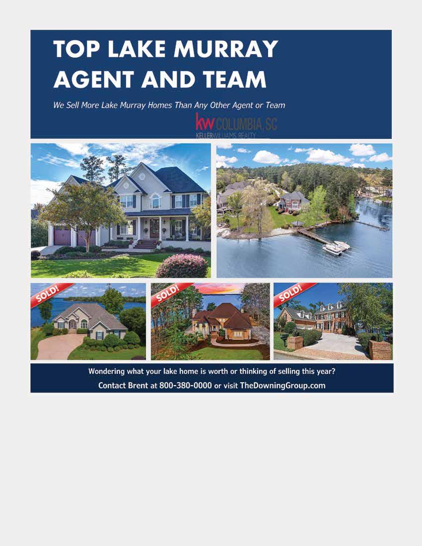 Wondering what your lake home is worth or thinking of selling this year? Contact Brent at 803-973-0804 or visit TheDowningGroup.com 604 WISTERIA KEY PLACE - CHAPIN OFFERED AT $1,895,000 1117 OLD ROAD, CHAPIN OFFERED AT $1,800,000