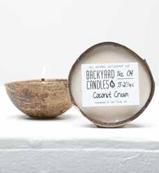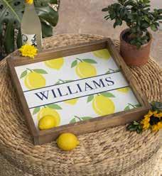 An embroidered green dragonfly adorns an eco-friendly fabric with a piped edge that’s hand-loomed of yarn made from recycled water bottles. $85 at Wayfair.com Walton Salad Bowl Set This 11” diameter bowl from Olive & Cocoa is crafted of acacia wood, has a food-safe lining, and comes with a pair of 12” tall wood servers that can stand on their own. $148 at OliveAndCocoa.com Sunny Lemon Personalized Tray Handcrafted in the U.S.A., this 17” square tray from Olive & Cocoa comes with free personalization. $178 at OliveAndCocoa. com Backyard Candles Made using up-cycled coconuts, natural soy/coconut wax, high-end fragrance, and clean-burning cotton wicks, plus 5% of the profit is donated to help clean up the oceans and protect coral reefs. $12.50 at BackyardCandles.com