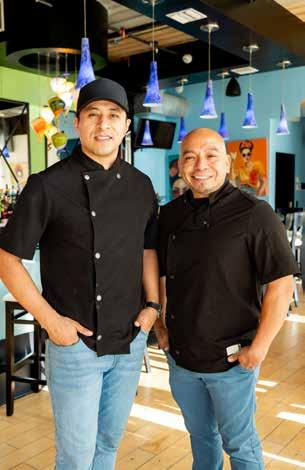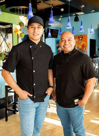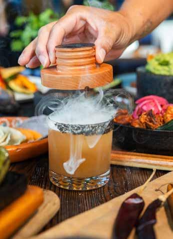 local artists, with soft, bright paint colors complemented by darker accent walls, rich wood tabletops, and natural woods, creating a warm and inviting atmosphere. The bar, adorned with tiles reminiscent of traditional Mexican designs, adds a touch of nostalgia and cultural authenticity. Guests can also enjoy the Frida lounge, a unique space decorated with vibrant works by artist Lipstick Lex, providing a perfect backdrop for a memorable evening.