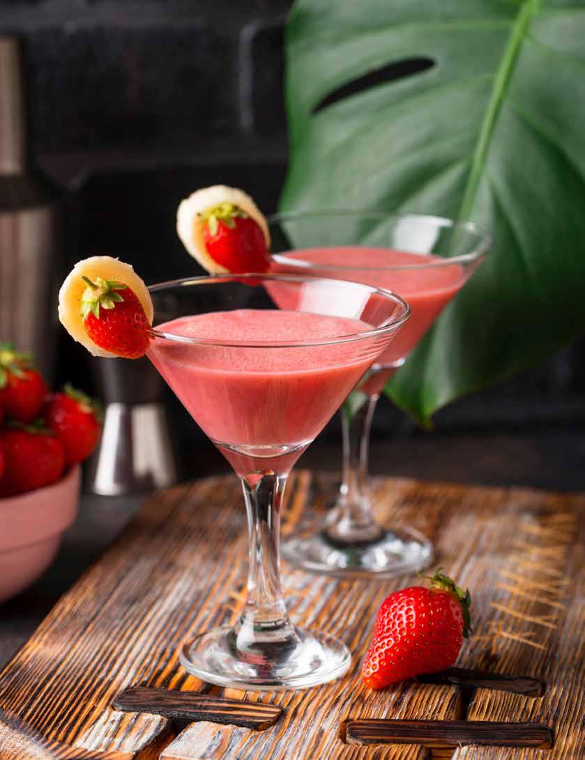 2. Add the vanilla vodka, Malibu Splash Peach Schnapps, strawberry puree, and a splash of banana liqueur to the shaker.
