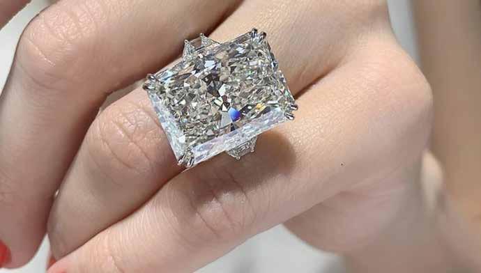 CENTER DIAMOND RADIANT 10.56 CARAT GIA CERTIFIED H COLOR VS1 CLARITY ON EITHER SIDE ONE CARAT EACH TRAPEZOIDS 12.56 CARAT TOTAL WEIGHT
