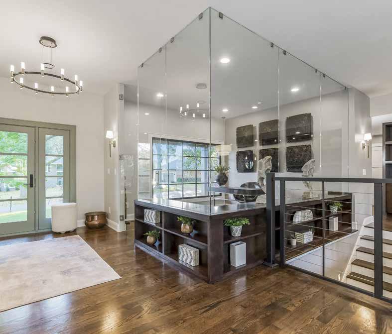 This design’s most unique aspect is the glass-walled office, which was a formal living room totally disconnected from the rest of the house. They wanted to be able to bring light from the large front window without losing the functionality of a home office. It also creates an entry hall rather than walking directly into the living room. Frameless glass walls make the space feel much larger than it is, and the built-in storage wall is functional from both sides and highlights the new stairs.