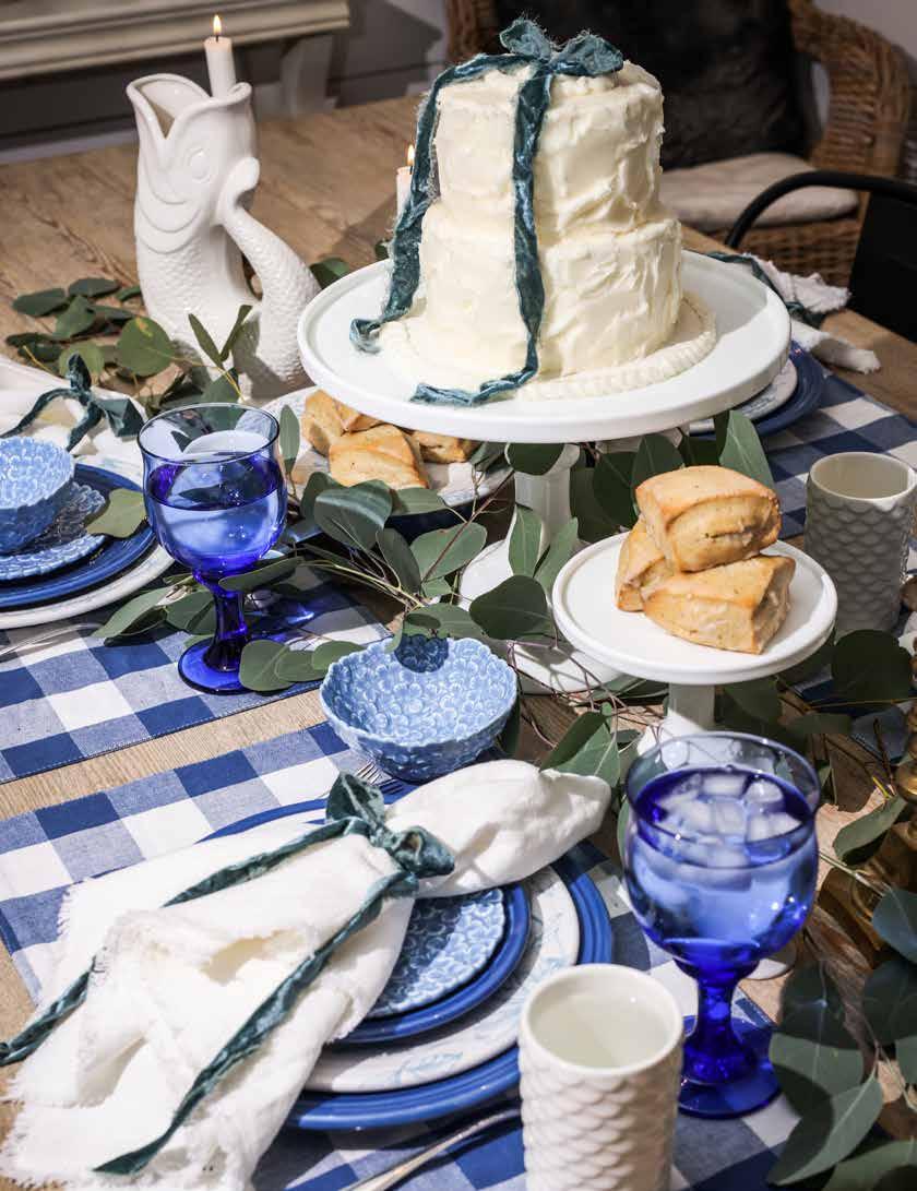 You would never know that this sophisticated look was created by using the timeless, everyday dinnerware line by Fiesta. To create this elevated table scape we used pieces from the Fiesta Botanical Floral line as well as Fiesta pieces in the color Lapis from Cockrell Mercantile. Combining these two lines along with delicate accent pieces creates a unique and elegant table that holds up to every day use as well as special moments too.  This look was built by adding pieces from Cockrell Mercantile including delicate floral bowls, scalloped white tumblers, complimentary blue stemware, white napkins tied with velvet bows, paired with a large patterned placemats in coordinating colors. The finishing touch of fresh eucalyptus placed as a centerpiece brings this whole look together— ready for a moment to be shared and remembered as long as these timeless pieces will last… a lifetime!