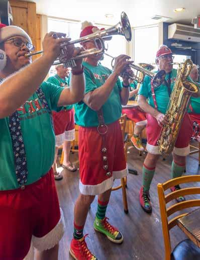 The group’s costumes are as legendary as their music. Summer gigs feature red shorts trimmed with white fur, green T-shirts, and Santa hats of every style imaginable. When winter rolls around, the band switches to red union suits and black shorts, still with white fur, of course. Many musicians decorate their instruments with lights, garland, and ornaments that glow as they play.