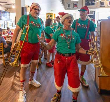 ride of Christmas joy. With a roster that includes trumpets, trombones, sousaphones, saxophones, banjos, violins, guitars — and even a keytar — the band’s energy is infectious.