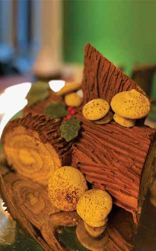 “I like chestnut flour for a unique twist,” Robert explains. Once the cake is baked, it’s filled with whipped cream, chocolate chips, and almonds, then rolled and frosted. Decorations can be as simple as powdered sugar for snow. Smythe adds meringue mushrooms and marzipan ivy leaves to evoke the magic of Christmastime.