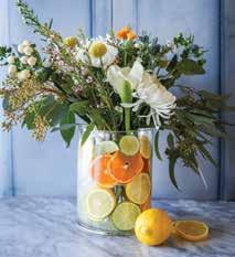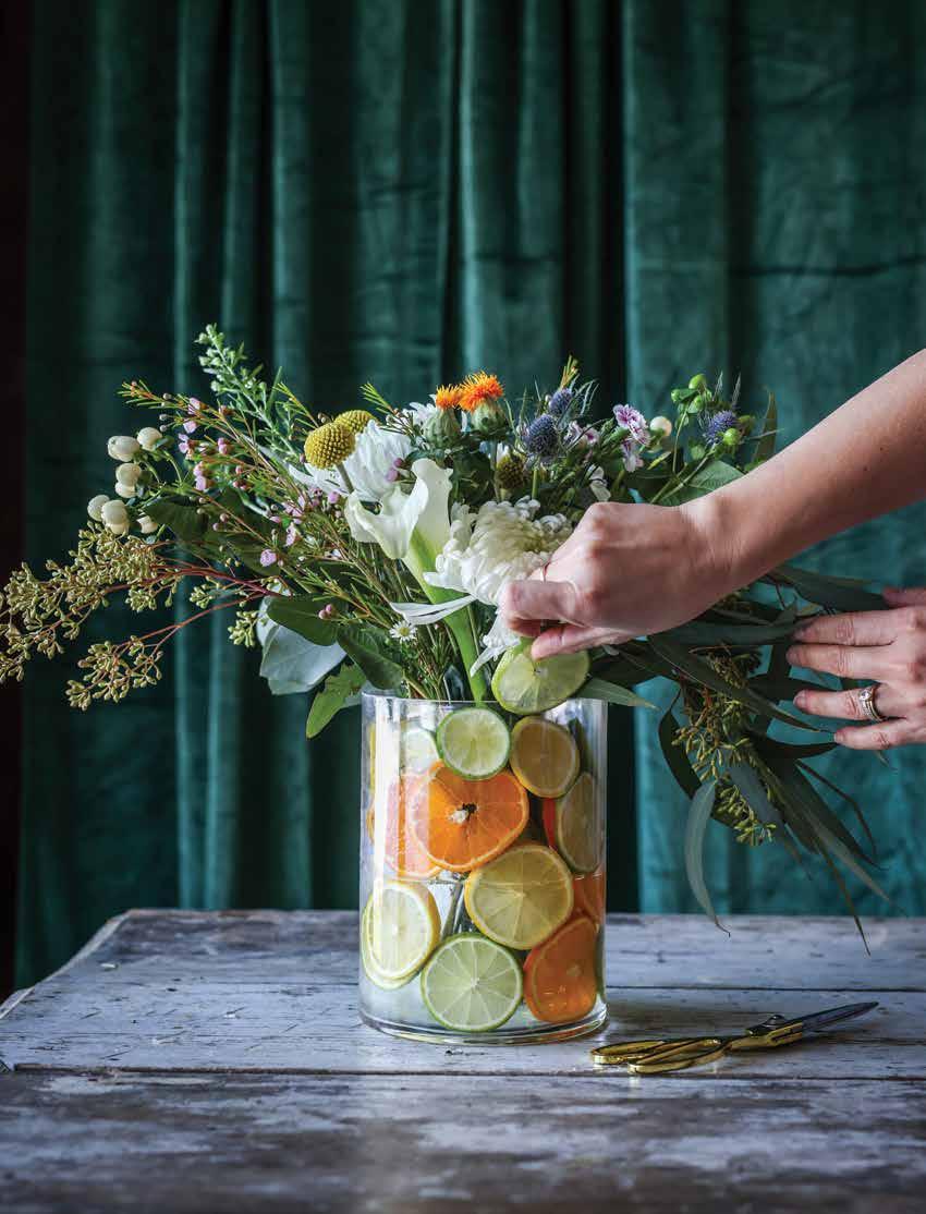 Add a burst of color and texture to your floral arrangement by layering fruit around the edges of your vase. To achieve this, place a smaller vase inside a larger one, ensuring the flowers stay contained in the inner vase. Fill the surrounding space with water, then arrange sliced fruit along the vase’s outer sides. For a fresh touch, add ice cubes to keep the fruit looking vibrant longer and to hold them in place. Not only will the flowers’ fragrance fill the air, but the citrus notes from the fruit will add a refreshing scent.