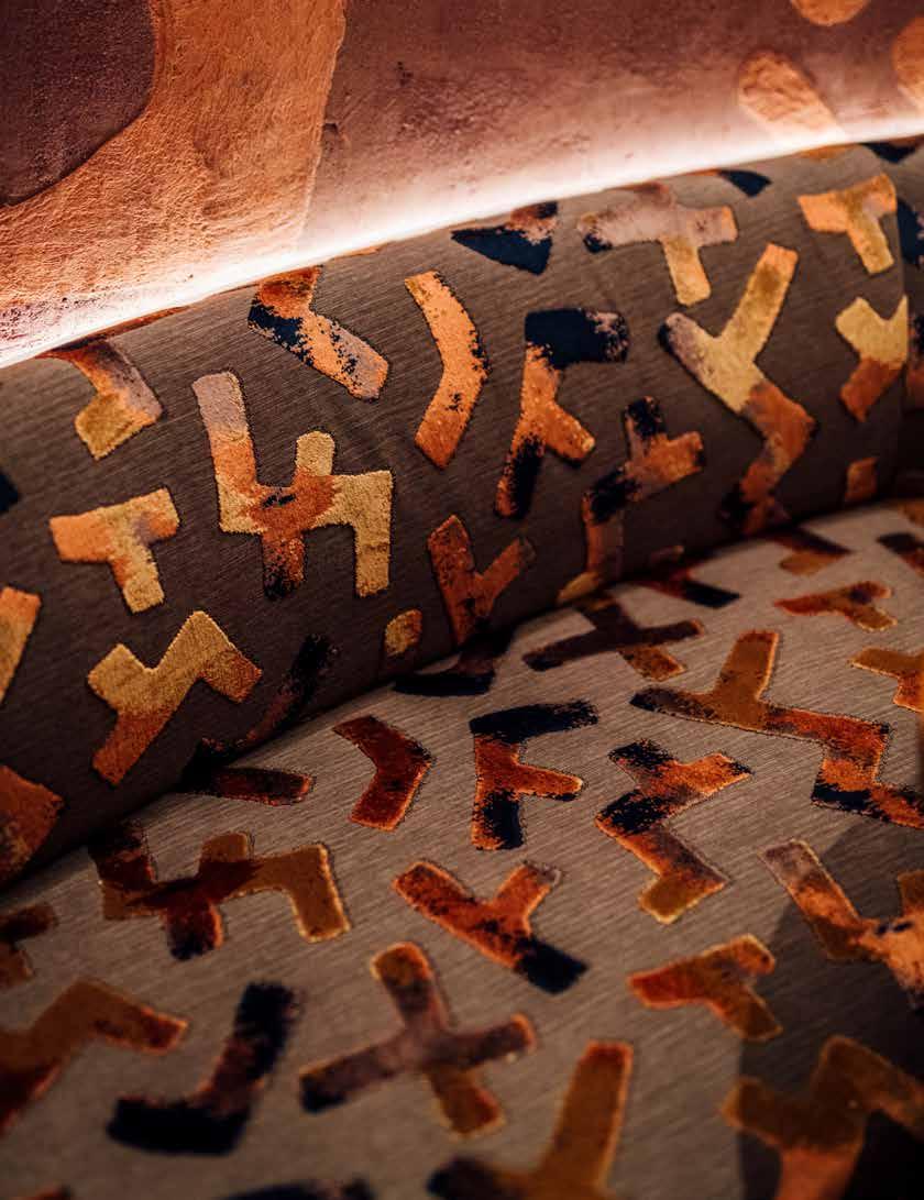 mud-finished wall, referencing traditional African mud walls. The bar and community tables feature a pattern inspired by Aso Oke, a traditional West African woven fabric. Designed by Nigerian American textile artist Shade Akanbi for Clay Imports, these elements highlight the significance of African craftsmanship, with custom tables by Objecktfab.