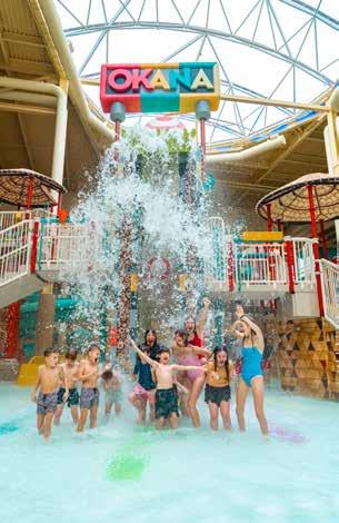 Set at a balmy 82 degrees, Okana's indoor waterpark is ready to welcome visitors year-round. Featuring 15 slides, a surfing simulator, lazy river, and wave pool, there is no shortage of thrills. There are also separate areas dedicated to young children and adults 21+, ensuring something for every age group. When it's time to relax, guests can grab a bite from the concession stands, lounge in the ample seating, or unwind in a private cabana. CONTINUED >