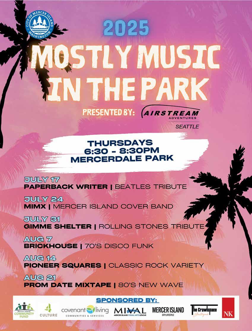 Celebrate summer island-style at the Mercer Island Summer Celebration, a family-friendly festival featuring live music, food trucks, a parade, fireworks, and art and community booths. Join neighbors and visitors for a day of activities in Mercerdale Park and an evening of live music and fireworks at Luther Burbank Park. More information @ mercerisland.gov/parksrec/ page/summer-celebration-2025