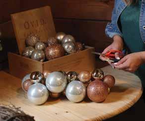 Add an ornament about 4” from one end of the wire and twist the wire around the top of the ornament to provide a base for your cluster. Twist about 5 times. You should still have about 4” of wire at the end; you will need it to tie onto your garland, tree, or wreath.
