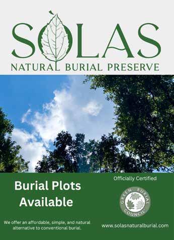 Certified by the Green Burial Council, Sòlas offers an environmentally friendly and financially responsible alternative to conventional burial. Sòlas is now offering sales for current need and pre-need plots. Their website offers the flexibility to customize the experience to each individual’s needs, and the onsite celebration shelter provides a convenient space to honor your loved one. Visit Sòlas at www.solasnaturalburial.com or at 6025 Oncken Road in Middleton.